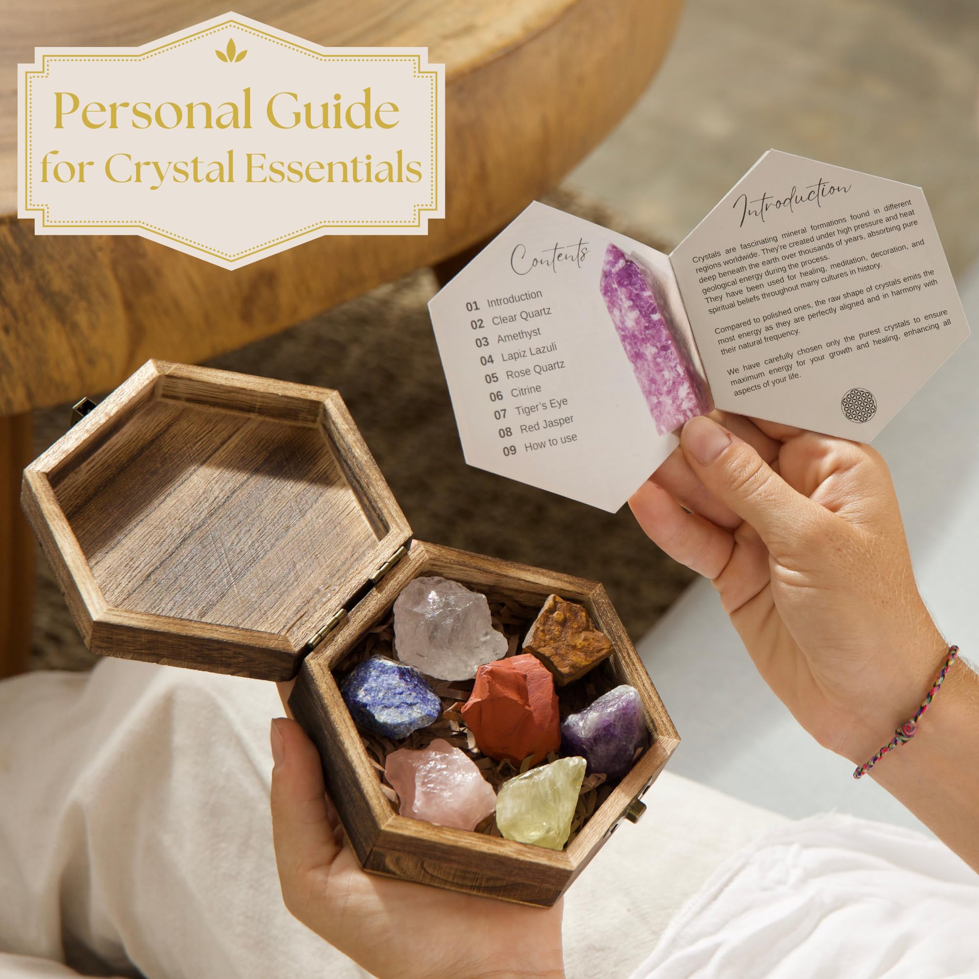 7 Chakras Crystals and Healing Stones with Guide Booklet – Large Raw Crystals and Stones Set Including Rose Quartz, Amethyst, and Lapis Lazuli in Wooden Box – for Healing and Protection